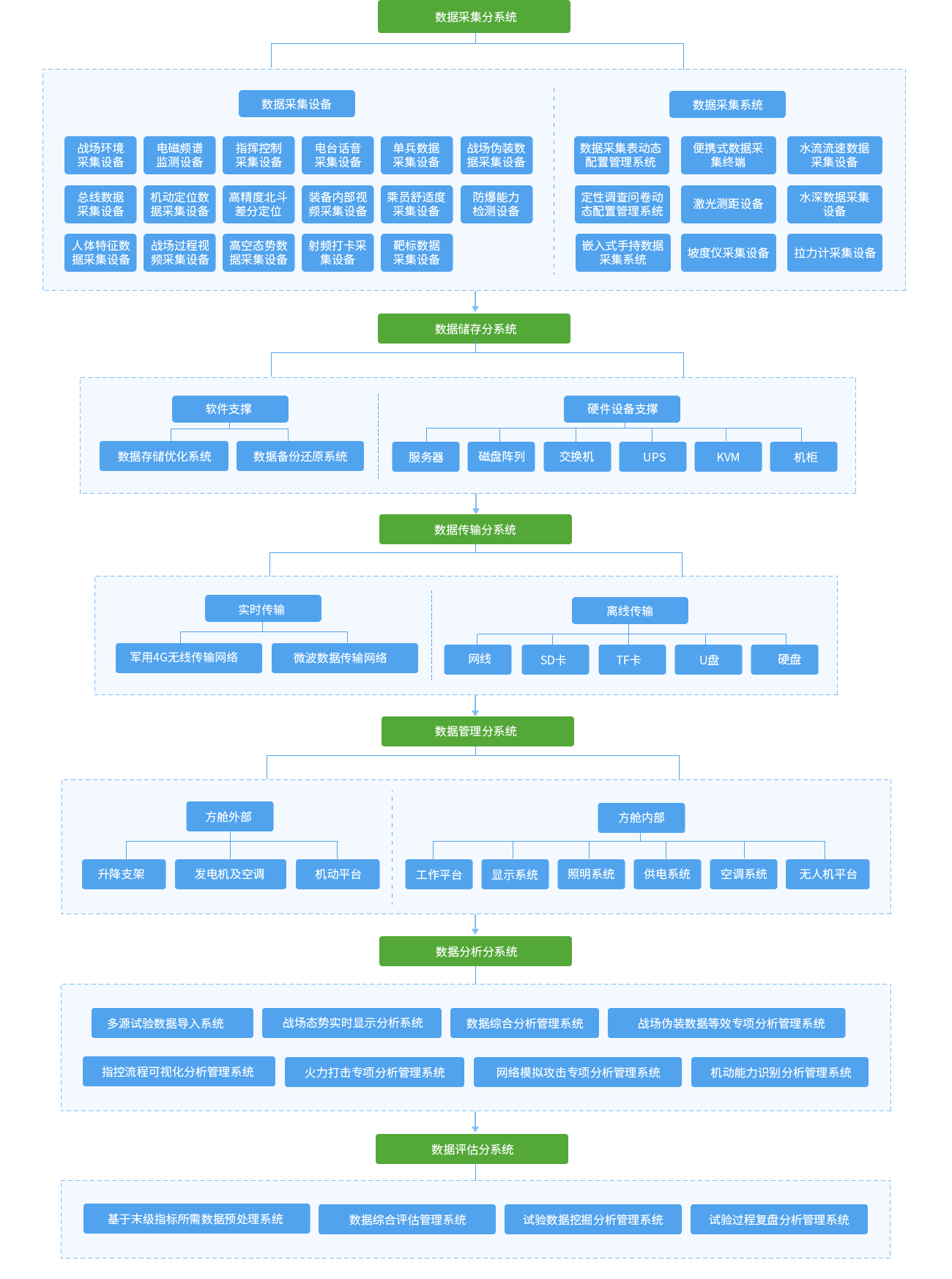 數據采集分系統主要包含自動化數據采集設備部分和手動數據采集部分。自動化數據采集設備主要有戰場環境數據采集設備、電磁頻譜監測設備、指揮控制數據采集設備、電臺話音數據采集設備、單兵數據采集設備、總線數據采集設備等;手動數據采集部分主要有數據采集表動態配置管理系統、定性調查問卷動態配置管理系統、嵌入式手持數據采集系統、便攜式數據采集終端、激光測距設備、水深數據采集設備等。能夠滿足裝備試驗過程中多源試驗數據的分類、分組精細化采集存儲。